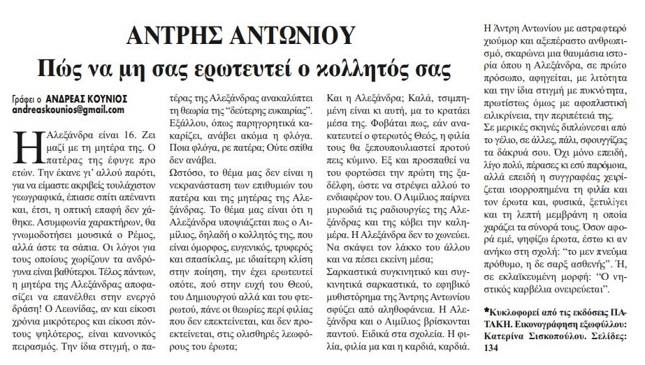 “Άλλο ένα καλογραμμένο κι ενδιαφέρον βιβλίο από την Άντρη Αντωνίου η οποία έχει πια αποδείξει το συγγραφικό της ταλέντο αλλά και την ικανότητά της να αφουγκράζεται τους έφηβους αναγνώστες της! Με αμεσότητα, χιούμορ και γλώσσα απλή, δίχως εκβιασμένους λογοτεχνικούς εντυπωσιασμούς η Άντρη Αντωνίου αποτυπώνει τις ανησυχίες της έφηβης ηρωίδας της. Κι όπως και στα προηγούμενα βιβλία της, η συγγραφέας φαίνεται ότι έχει επεξεργαστεί σε βάθος το θέμα της. Οι ήρωες εμφανίζονται στις σελίδες του βιβλίου ολοκληρωμένοι και γήινοι. Ερωτεύονται, ζηλεύουν, ανησυχούν κάνουν λάθη και προσπαθούν να επανορθώσουν. Η αποτύπωση των σχέσεων τόσο των εφήβων μεταξύ τους όσο και με τους γονείς τους παρουσιάζεται τόσο εύστοχα να αμφιταλαντεύεται ανάμεσα στην παιδικότητα που φεύγει και την ενηλικίωση που αναπόφευκτα έρχεται.”